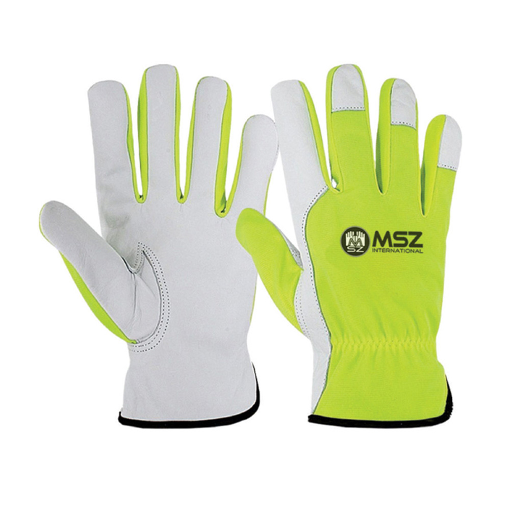 Assembly Glove Palm made of natural Sheepskin Grey leather back yellow spandex, inside Thinsulate with playboy lining, elastic on wrist black tape piping on edge.