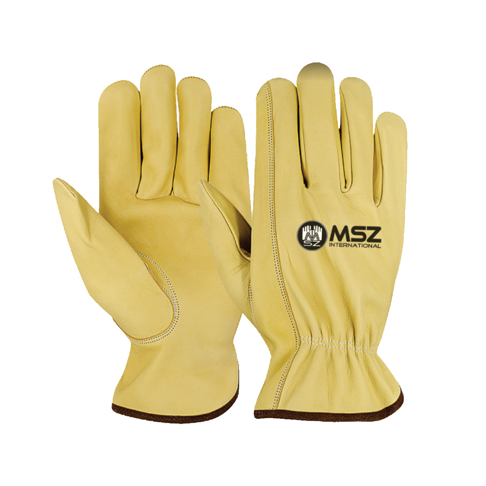 Driver Gloves Palm & Back made of Cowhide yellow color Leather, Key stone thumb, elastic on wrist, brown tape piping on edge.