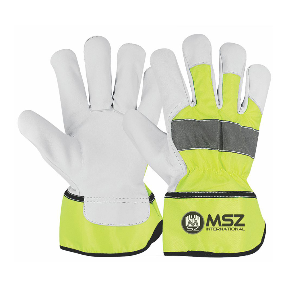 Hi-Visible Reflective glove, Palm made of Cowhide Grey color leather, back fluorescent fabric, and knuckle strap, inside palm fleece lining, rubberized safety cuff with black tape piping on edge.
