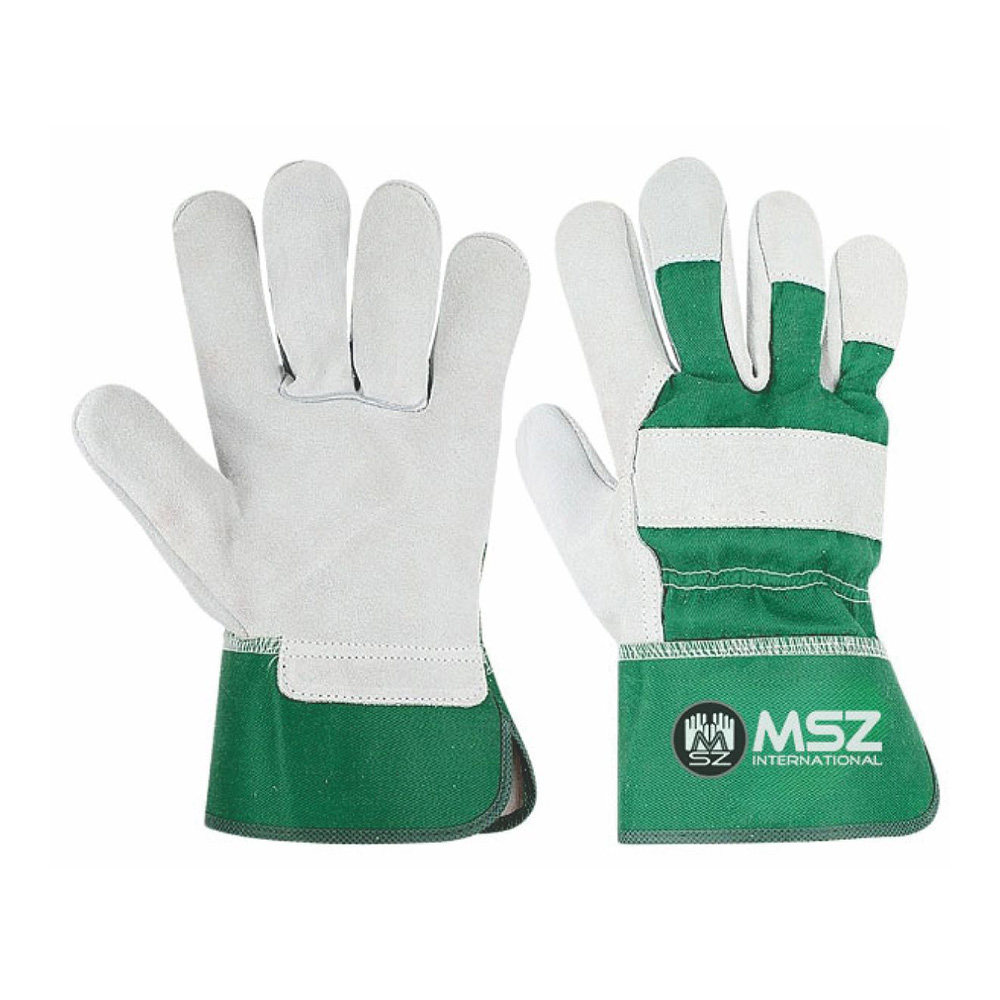 Industrial Gloves made of palm cow split leather grey color & back green cotton fabric, Inside fleece lining on palm, Wing thumb, knuckle strap, rubberized safety cuff with green tape piping on edge.