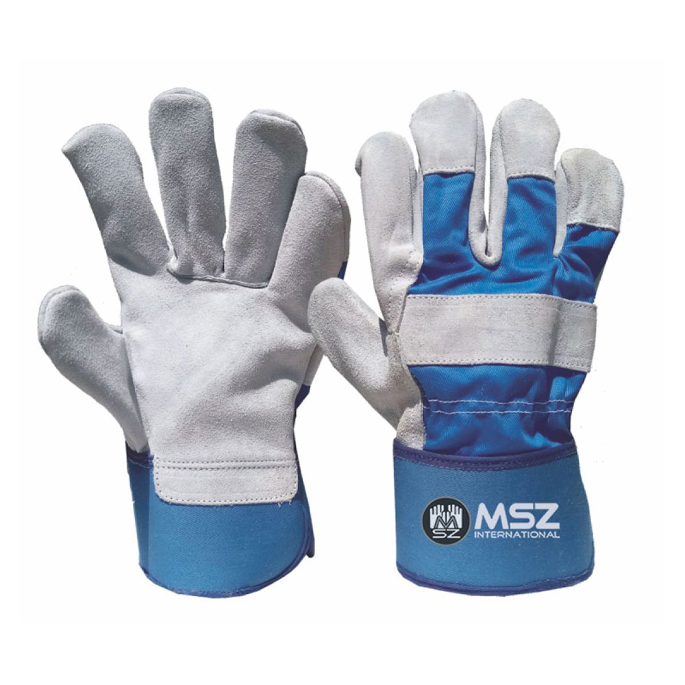 Industrial Gloves made of palm cow split leather & back blue cotton fabric, Inside fleece lining on palm, Wing thumb, knuckle strap, rubberized safety cuff with blue tape piping on edge.