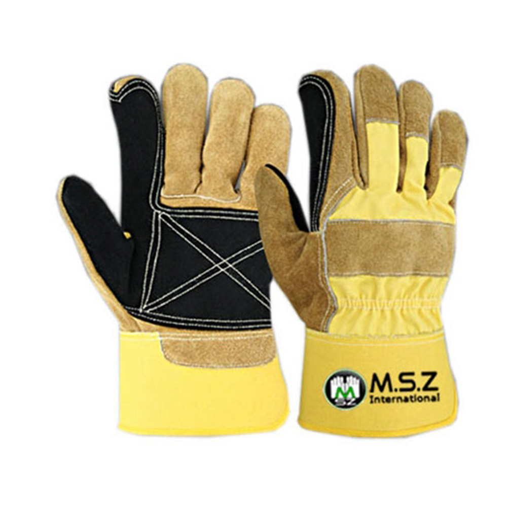 Industrial Gloves made of palm cow split leather yellow color with extra reinforcement on palm black color leather, back cotton fabric, Inside fleece lining on palm, Wing thumb, knuckle strap, rubberized safety cuff with yellow tape piping on edge.