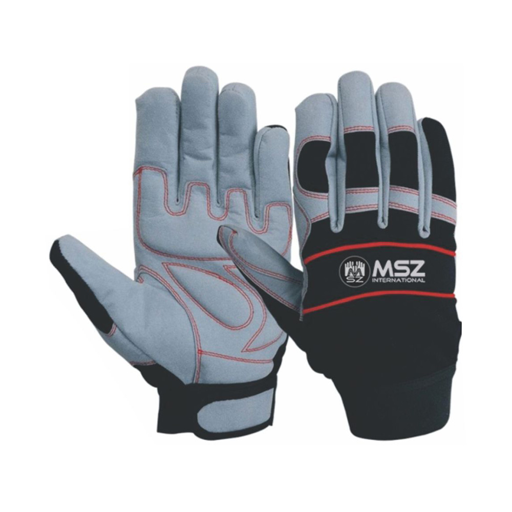 Mechanic Glove palm made of grey synthetic leather, Foam padding at palm, back spandex with Velcro strap cuff.