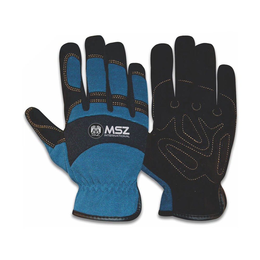 Mechanic Glove palm made of black synthetic leather, back light blue spandex, foam padding at palm, finger tips on back, black piping on edge.