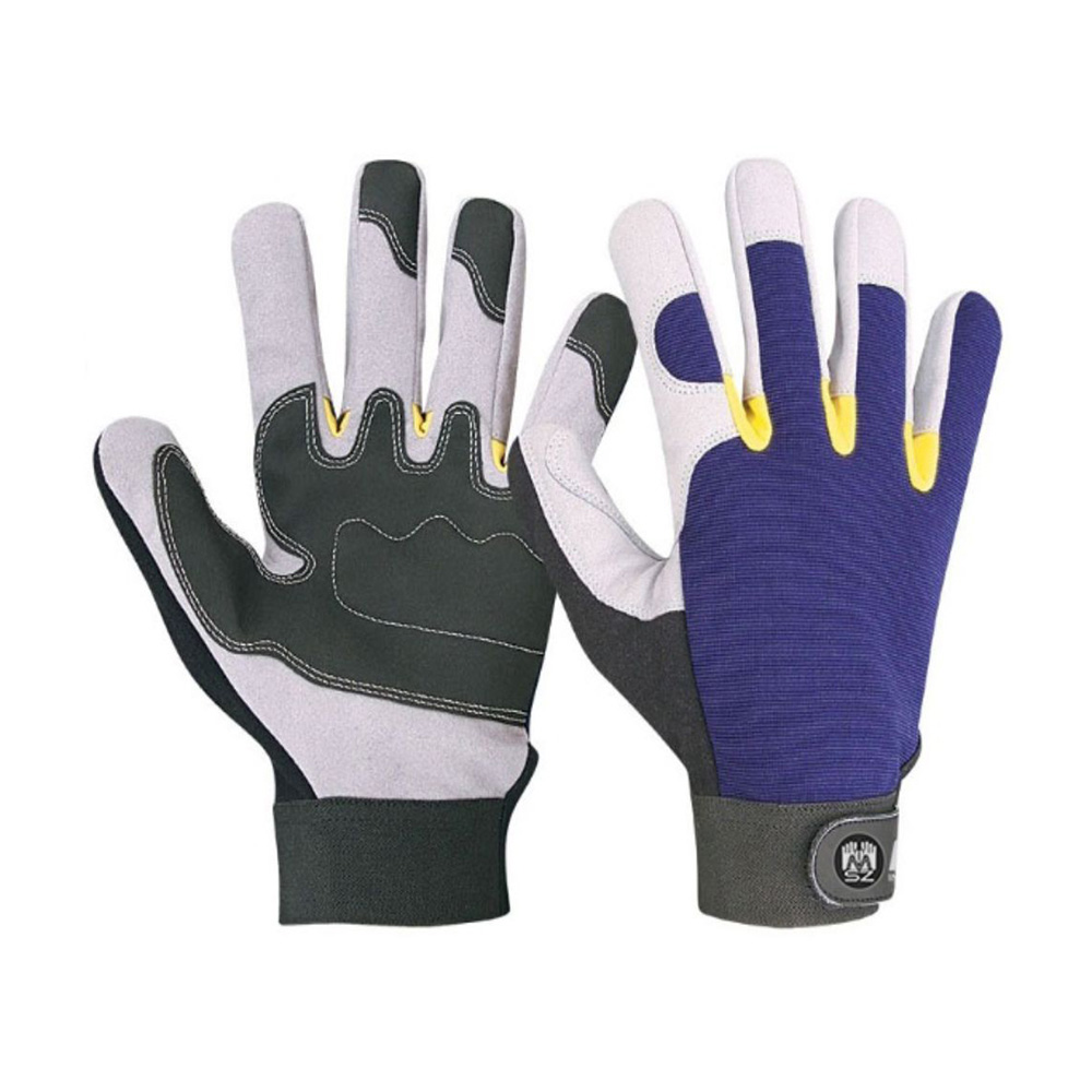 Mechanic Glove palm made of grey synthetic leather with extra reinforcement on palm black color, back blue spandex with Velcro strap at cuff.
