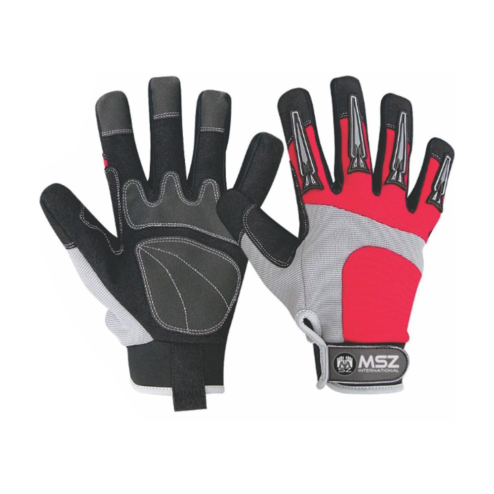 Mechanic Glove palm made of black synthetic leather with extra reinforcement on palm grip material, back grey/red spandex with Neoprene Velcro strap at cuff.