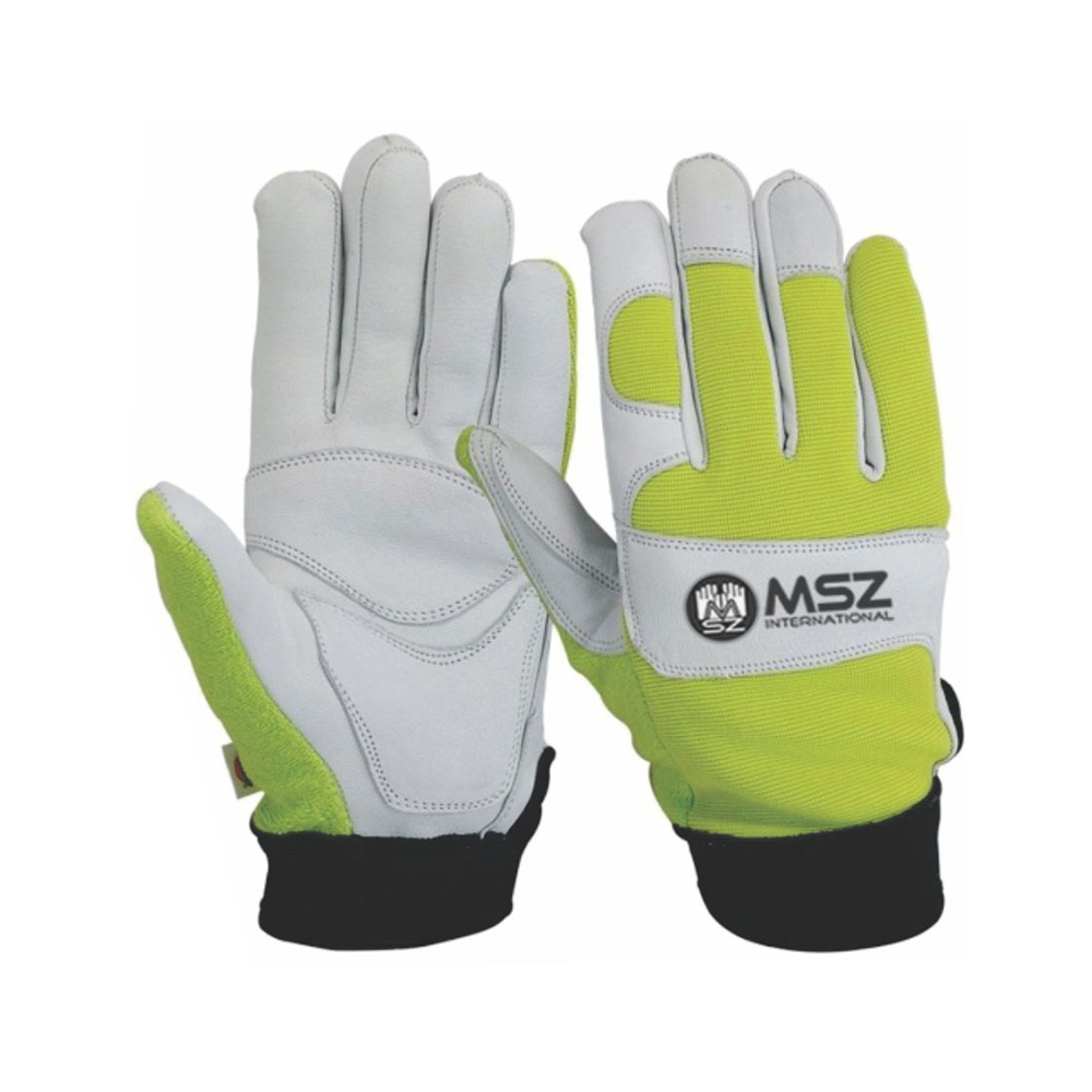 Mechanic Glove palm made of goatskin grey leather with extra reinforcement on palm, back yellow flour cent spandex with Elastic Velcro strap at cuff.