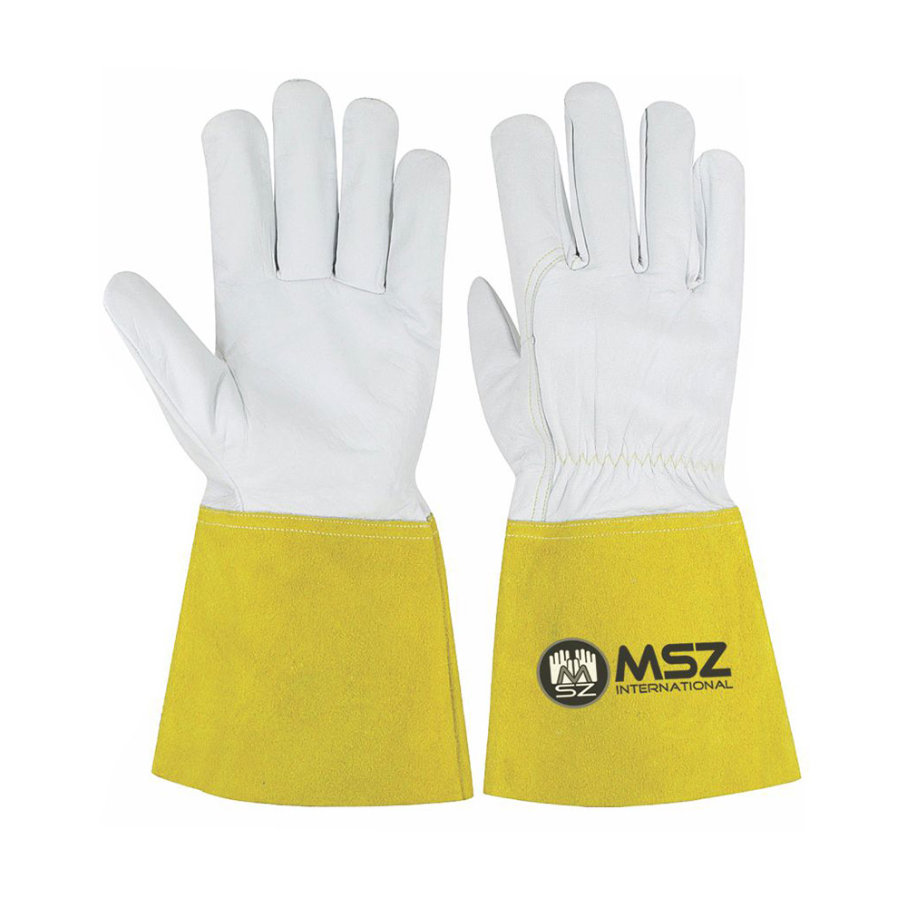 Tig Welding Glove, Palm & back made of buffalo grey leather, Wing thumb, with cow split leather yellow color safety cuff 15cm.