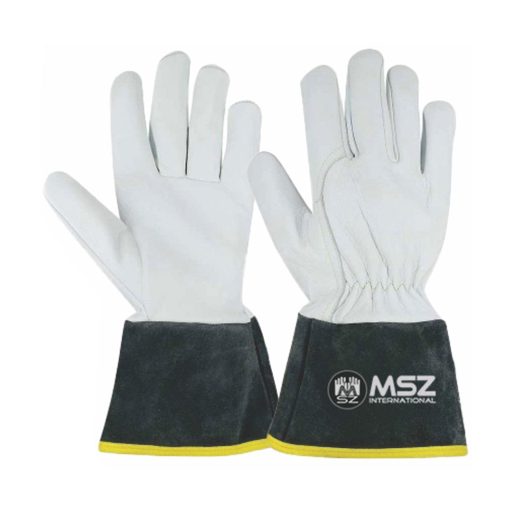 Tig Welding Glove, Palm & back made of Goatskin grey leather, inside full lining, Wing thumb, with cow split leather black color safety cuff 15cm with yellow piping on edge.
