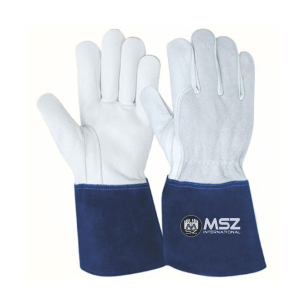 Tig Welding Glove, Palm made of cowhide grey leather back cow split leather, Wing thumb, Reinforcement round thumb,with cow split leather blue color safety cuff 15cm.