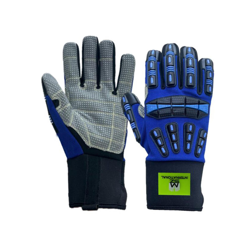 TPR Mechanic Gloves palm made of synthetic leather with extra reinforcement on palm with silicone printing, back blue spandex, neoprene with lycra cuff, inject plastic mold protection on back.