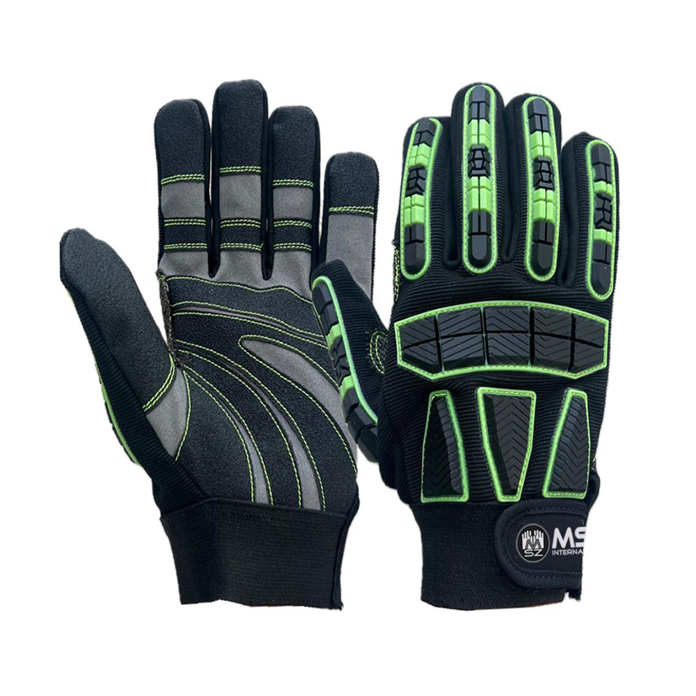 TPR Mechanic Gloves palm made of synthetic leather, with extra reinforcement on palm grippe material,back black spandex, inject plastic mold protection on back with elastic velcro closure.